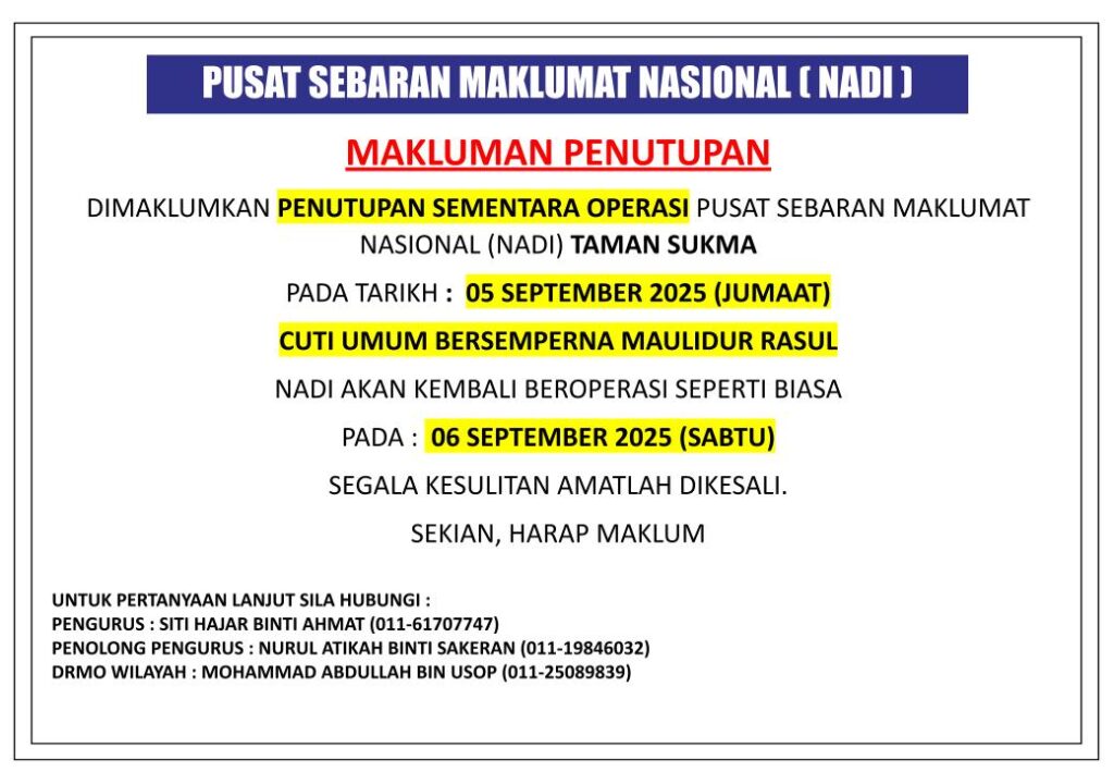 Dimaklumkan bahawa Pusat Sebaran Maklumat Nasional (NADI) Taman Sukma akan ditutup sempena Cuti Umum Maulidur Rasul.