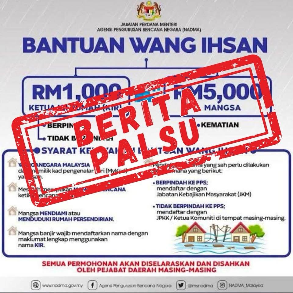 Sebarang maklumat sahih mengenai Bantuan Wang Ihsan (BWI) boleh dirujuk melalui portal rasmi NADMA nadma.gov.my/bm/awam/bantua…. Individu yang didapati menyebarkan maklumat palsu boleh dikenakan tindakan dan hukuman sewajarnya.